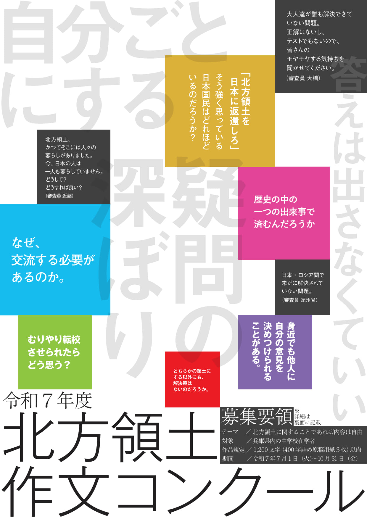 兵庫県内の中学生が、北方領土の現実に関心を高めるとともに、北方領土が歴史的経緯や国際法に照らしても、日本の固有の領土であることを正しく理解することを目的として実施しています。