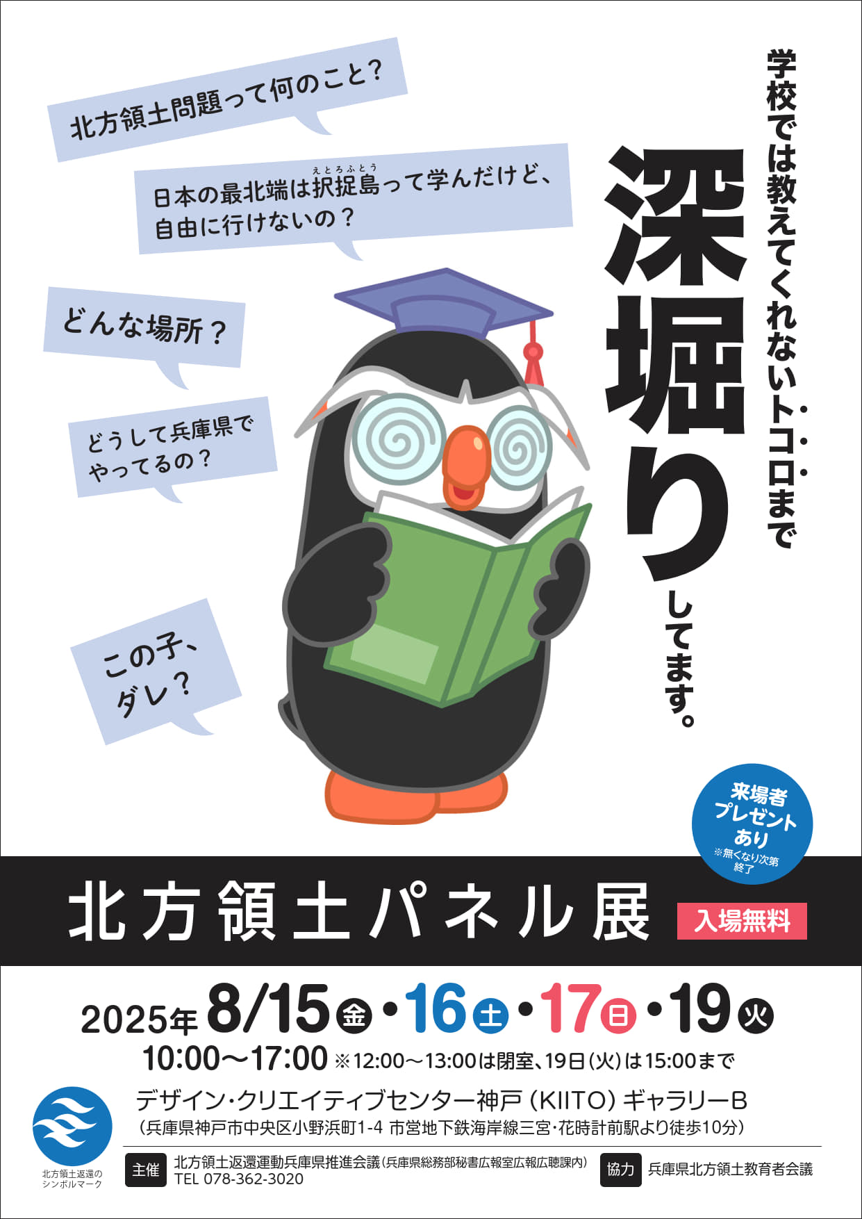 兵庫県における北方領土学習の進展に寄与することを目的として設立され、北方領土学習の研究及びその成果の発表、研究会、講習会等の開催、北方領土啓発パネルの作成・展示等を行っています。