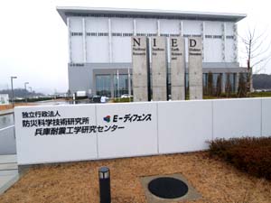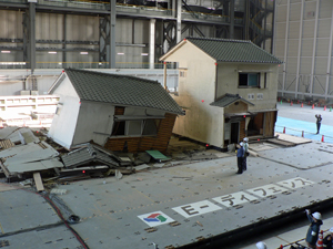 「三木総合防災公園都市(みきそうごうぼうさいこうえんとし)」にある実大三次元震動破壊実験施設(じつだいさんじげんしんどうはかいじっけんしせつ)(E-ディフェンス)では、地震(じしん)のとき、建物(たてもの)が実際(じっさい)に「どう壊(こわ)れるのか」「どこまで壊(こわ)れるのか」「なぜ壊(こわ)れるのか」を明らかにします。また、縦(たて)15メートル、横(よこ)20メートルもある震動台(しんどうだい)は3方向同時に動かせて、規模(きぼ)は世界最大(せかいさいだい)です。 |