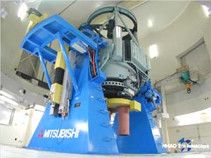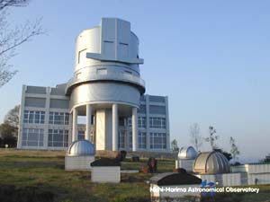 西はりま天文台公園(てんもんだいこうえん)にある「なゆた」望遠鏡(ぼうえんきょう)は、星からやってきた光を集(あつ)める主鏡(しゅきょう)の大きさが2メートルあり、公開用(こうかいよう)の望遠鏡(ぼうえんきょう)としては世界一(せかいいち)の大きさです。 |
