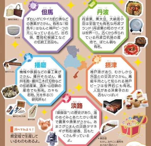 兵庫県はむかし、摂津(せっつ)、播磨(はりま)、但馬(たじま)、丹波(たんば)、淡路(あわじ)の5つの国に分かれ、それぞれの地形や気候をいかした産業をはぐくんできました。