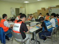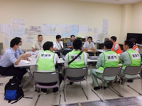 関西広域連合・石巻市支援本部では、週に2回、市町派遣職員を交えたミーティングも行われています。市町派遣職員からは「何でもやるので役割に関わらず指示をどんどん出してほしい」と要望が出るなど、活発な意見交換がされ、支援活動につなげています。 |