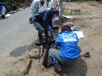 ひょうごボランタリープラザが募集した兵庫県ボランティア78名が、東松島市内でボランティア作業を行いました。この日は側溝から泥を掻き出し土嚢袋に詰めていく作業です。参加者の一人は「阪神・淡路大震災を経験しているので、必ず来ようと思っていた」と話しています。 |