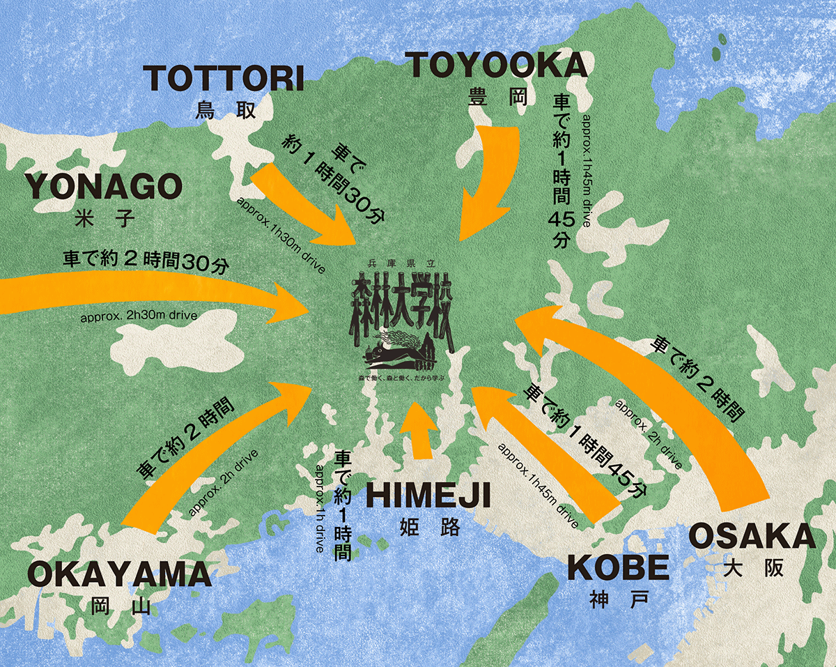本校にお越しの際は、自動車が便利です。自動車なら姫路から約1時間、三宮から約1時間40分、大阪から2時間ほどです。中国自動車道山崎インターチェンジを下りてから約30分で本校に到着します。