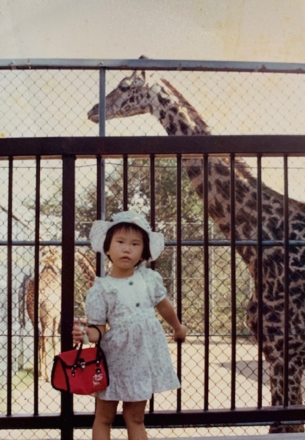 家族で王子動物園によく行き、たくさんの思い出のある動物園。大好きなキリンの前でハイポーズ!〔令和2年度応募写真〕