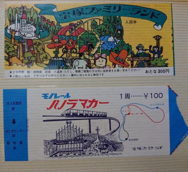 宝塚ファミリーランドの入場券の写真です。入園料大人300円、モノレールパノラマカー100円。大切にとってありました。〔令和2年度応募写真〕