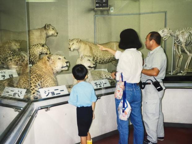 幼稚園の帰りに行った阪神パークでレオポンの剥製を見学し、飼育係の人に「お父さんはヒョウ、お母さんはライオン。阪神パークで5頭が生まれたんだよ」と説明してもらいました。レオポンが生まれたのは1959年と1961年。生命倫理の点から、現代ではありえない貴重な存在だったんですね。〔令和2年度応募写真〕