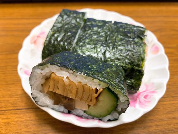 催事等で出店すると開店後即完売してしまうマイスター工房八千代の天船巻き寿司。大きめの具材がいいアクセントになって美味しいです。なんといってもキュウリの存在感がすごい!〔令和2年度応募写真〕