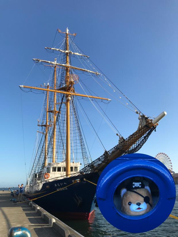 神戸の港では、時々素敵な帆船が立ち寄っているのを見かけます。これは「帆船 みらいへ」を見つけたときの写真です。帆船の丸い小窓から誰かがこっちを見ていたので、そっと近づいて見てみると、くまのかわいいキャプテンでした。船員さんの遊び心が忘れられない、よい思い出になりました。〔令和2年度応募写真〕