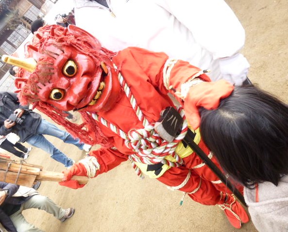 三木市にある大宮八幡宮の鬼追い。大きな鬼や小さな鬼が、連なって歩く姿は圧巻です。はじめ、怖がって泣いていた娘も、なんとか小鬼に頭をなでてもらうことができました。一年元気に過ごせるかな。〔令和2年度応募写真〕