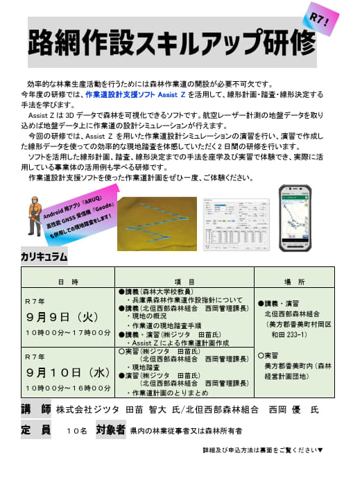 そこで、活用が進む航空レーザー計測で得られた詳細な地形データ等を活用し、地盤データ上に作業道設計シミュレーションをすることができ、効率的な作業道現地踏査・作業道計画につなげることができる作業道設計支援ソフトAssistZを使った研修を開催します。