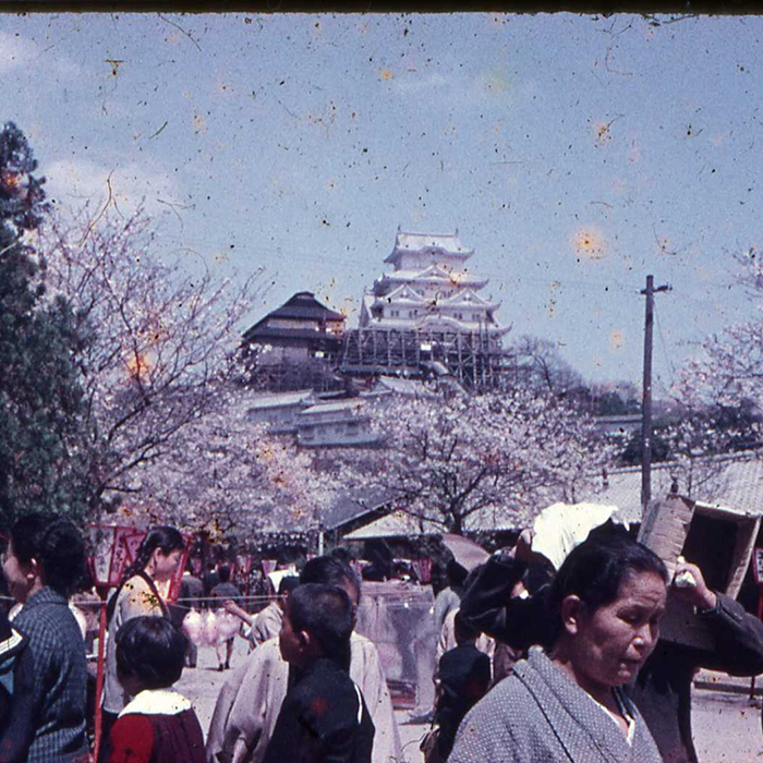 - 姫路城の昭和大修理直後の城内でのお花見風景です。今も昔も変わらない美しい桜の名所である姫路城。着物姿の花見客が多く見受けられるのは、やはり時代を反映したものです。