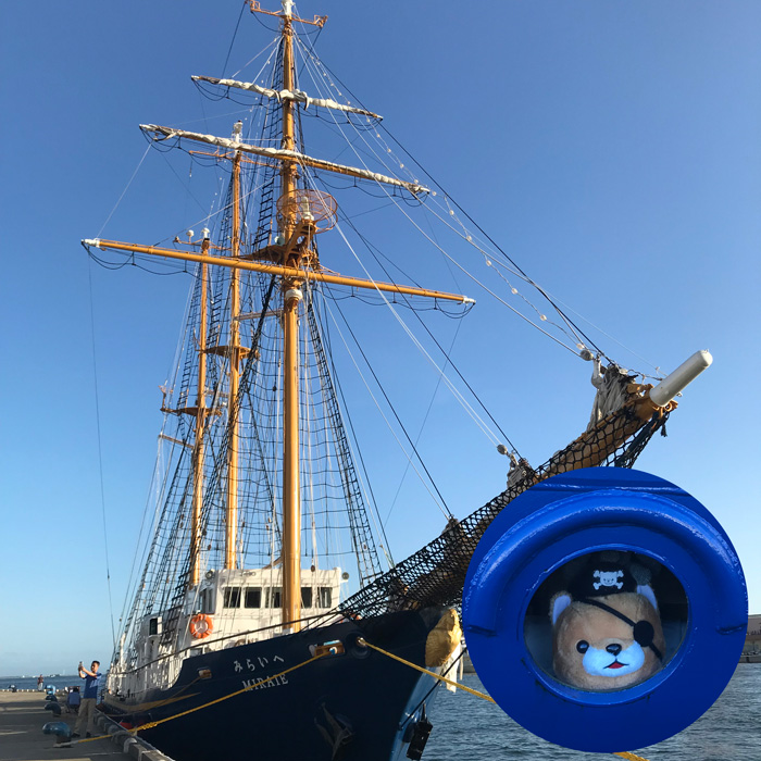- 神戸の港では、時々素敵な帆船が立ち寄っているのを見かけます。これは「帆船 みらいへ」を見つけたときの写真です。帆船の丸い小窓から誰かがこっちを見ていたので、そっと近づいて見てみると、くまのかわいいキャプテンでした。船員さんの遊び心が忘れられない、よい思い出になりました。