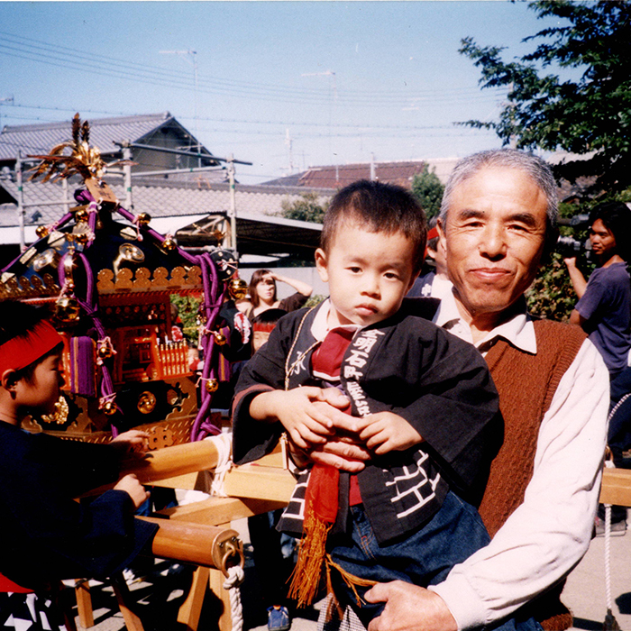 - 盆も正月も何も言わない父が、祭りだけは帰ってこいよと言ってました。今は女の子でも乗れますが、私の時代は女の子は屋台にのれなかったので男の子が生まれたら、屋台にのせると張り切っていました。息子は大泣きでしたが(笑)。子ども神輿の前で、亡き父との記念写真です。