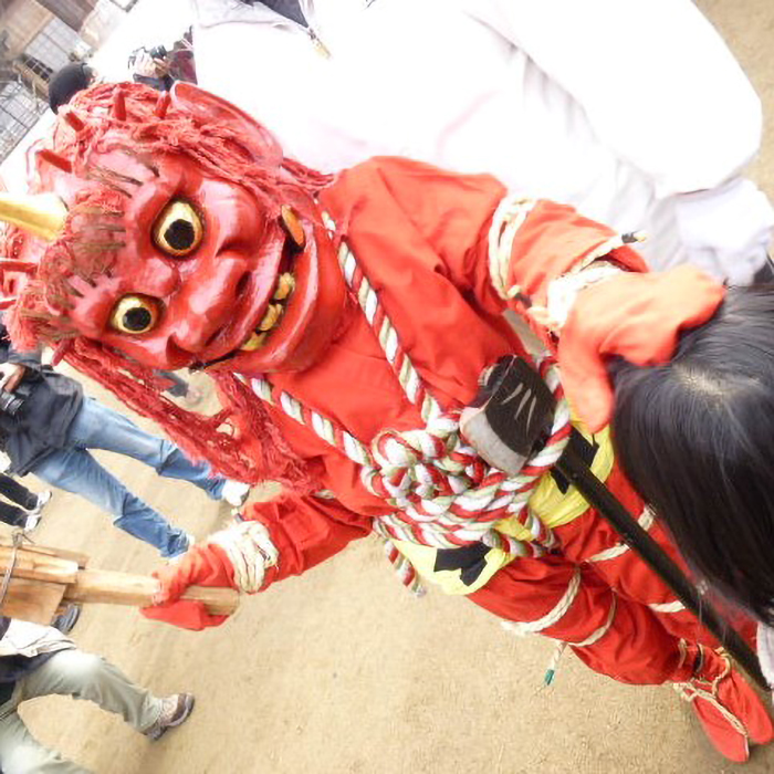 - 三木市にある大宮八幡宮の鬼追い。大きな鬼や小さな鬼が、連なって歩く姿は圧巻です。はじめ、怖がって泣いていた娘も、なんとか小鬼に頭をなでてもらうことができました。一年元気に過ごせるかな。