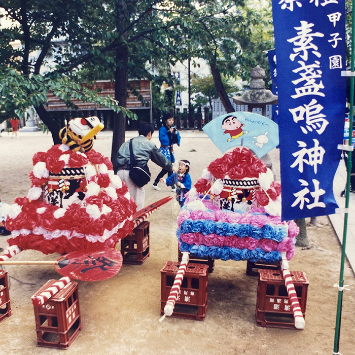 - 甲子園球場のとなりにある、すさのお神社の秋祭りです。揃いのハッピとねじり鉢巻で町内を練り歩いたあとは、お菓子をたくさんもらって、友達や妹と一緒に食べたのが楽しかった思い出です。