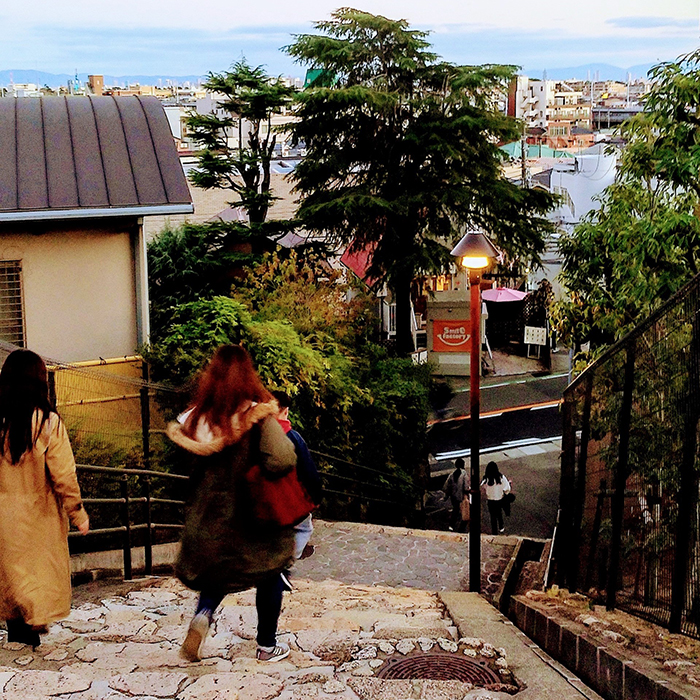 - 阪急甲東園から坂道を登って通学した人は多いと思います。昭和40年代後半、私もその1人でした。丘の上にある中学校、高校に通った6年間。行きは、クネクネ登り坂。遅刻しそうなときは下から頴川美術館の先の石段を駆け上がることもありました。当時は、幅は狭く石段も急で鬱蒼と木が茂る山の中を抜けるため、帰り道、女子はあまり使いませんでした。でも、石段の上から見る駅前の眺めは、昔も今もあまり変わっていないように思います。