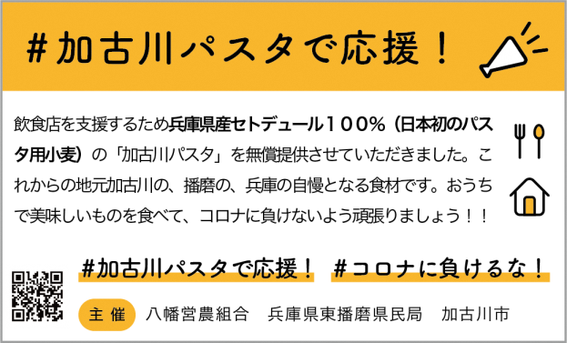こんな時だからこそ、私たちにできることで応援したいという想いから、飲食店の皆様へ加古川パスタを無料で提供するとともに、加古川パスタをテイクアウトやデリバリーできる情報サイトを立ち上げました。各店の自慢の味をご賞味下さい。