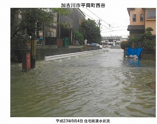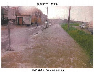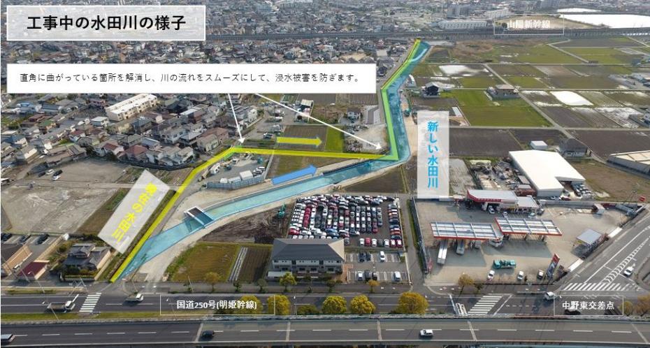 平成23年・25年の大雨や26年台風11号など過去幾度も浸水被害が発生している水田川です。今年、直角に折れ曲がっている箇所を解消し、川の流れをスムーズにしました。今後は、毎秒20t(←現在の約4倍)の水を流せるようにする改修工事を進め、令和4年春に完成予定です。