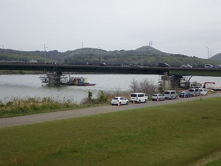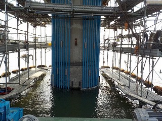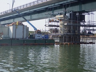 加古川に架かる上荘橋(上荘町都染)は、昭和45年6月の洪水で流失し、昭和48年に建設され約50年が経過しています。現在、橋脚を太くする耐震工事を実施中です。水中でも施工できる特殊な工法で工程もコストも短縮します。工事現場で珍しい工法をご覧下さい。