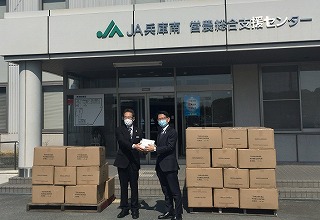 兵庫南農業協同組合から東播磨県民局に、紙マスク(一般用)10万枚を寄贈して頂きました。