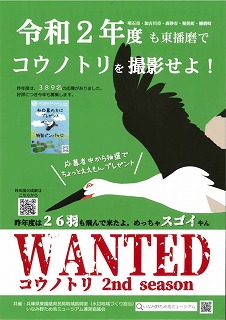 今年も「WANTED コウノトリ」がスタート。令和元年度は、前年度の2倍、26羽のコウノトリが飛来。今年はそれ以上のコウノトリの飛来を期待します。みんなで探しましょう。