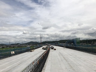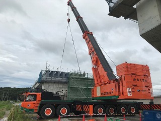 東播磨道北工区(加古川市~小野市)の建設工事が最盛期。毎日風景が変わっています。加古川市八幡町内では橋梁工事。日本最大級の550t吊りクレーン車による長さ約24mの橋桁架設は見応えがありました。