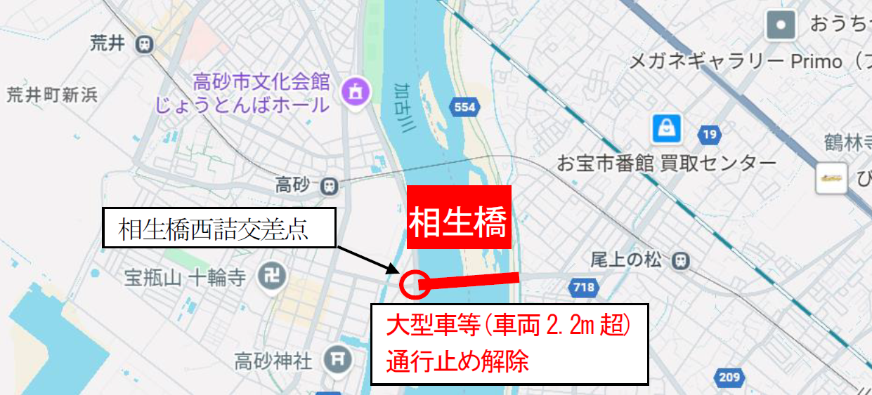 このため、平成22年度から交通安全施設事業に着手し、令和5年11月より北側橋梁を通行止めにし、大規模な拡幅工事を行っておりましたが、この度、工事が完成したので、下記のとおり、拡幅した北側の相生橋へ自動車交通を切り替えると同時に工事に伴う大型車(車幅2.2m超)通行止めを解除しますので、お知らせします。なお、歩行者・自転車は南側の相生橋を通行してください。