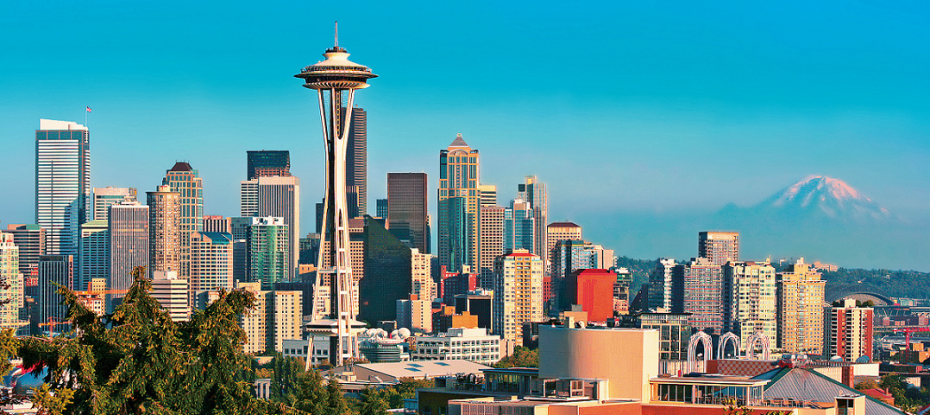 Seattle, la ciudad más grande del Estado de Washington Subiendo a la Space Needle (Aguja Espacial) (la torre en el centro de la foto), puede ver en la lejana el Monte Rainier con la nieve firn y desde lo alto, la ciudad de Seattle. |
