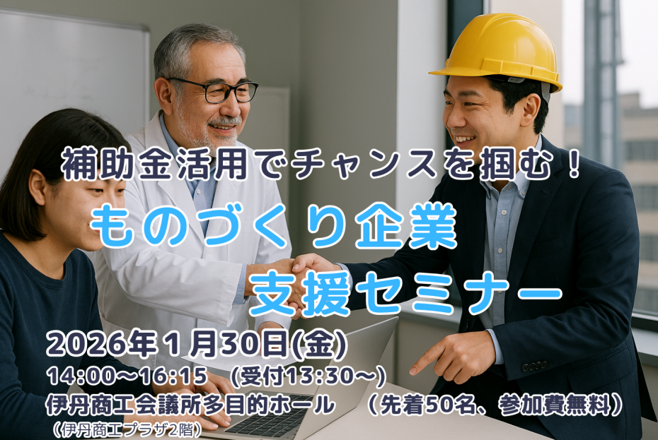 また、資金力の弱い中小企業にとっては、研究開発費の調達といった大きな課題もあります。そこで、技術支援機関のサポートや研究開発補助金等の情報とともに、それらを活用した生産性向上、産学連携の好事例を紹介し、阪神北ものづくり企業のイノベーションの加速化を支援するためのセミナーを開催します。
