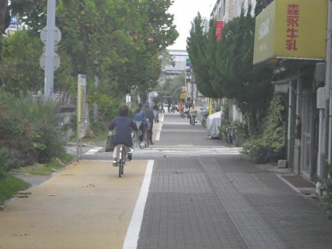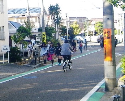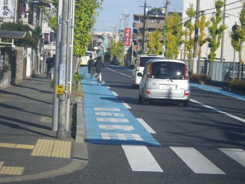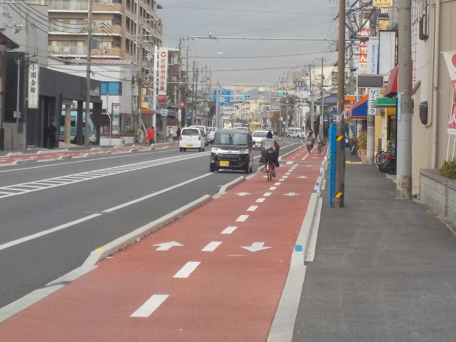 歩行者と自転車、自動車との錯綜による事故を防止するため、自転車道の整備や、路肩のカラー舗装等による安全対策を実施しています。