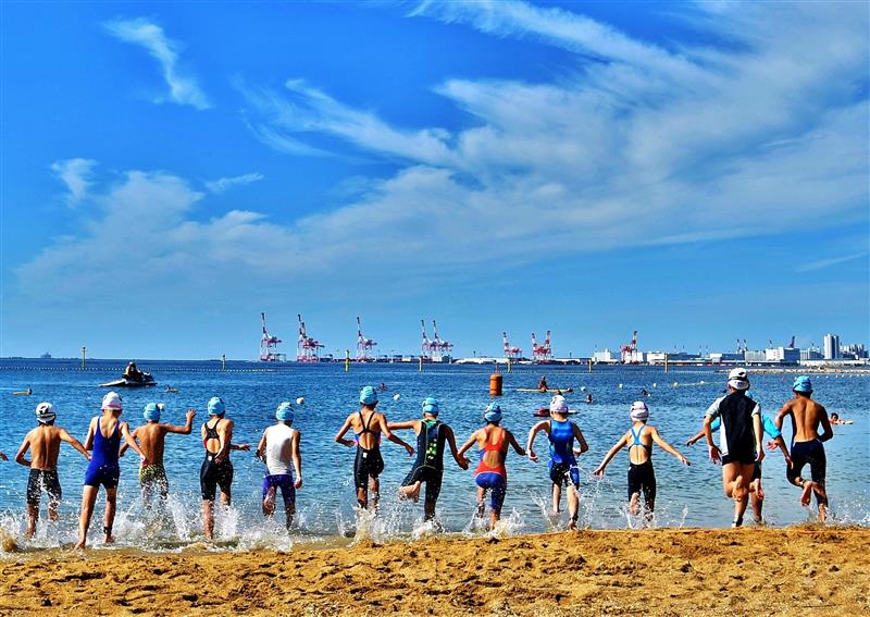令和5年9月に開催された第14回潮芦屋ビーチで開催されたアクアスロン大会の一コマ。多数の小中学生も参加した。 |