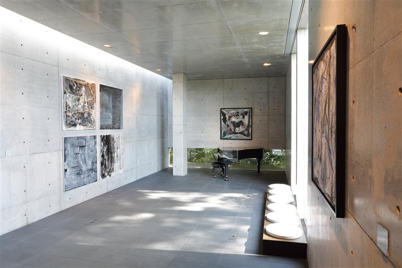 館内に入ると、曲面と平面のコンクリートが創出する静謐で無垢な空間にアート作品が浮かび上がるかのよう。