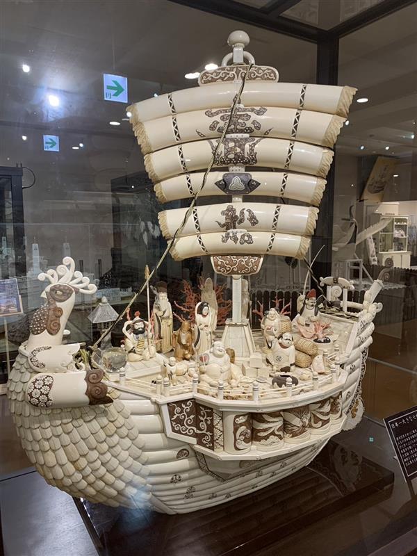 「日本最大級 大きな象牙彫刻宝船」などの象牙彫刻作品を多数展示