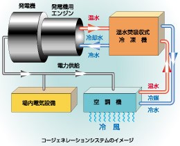 三田浄水場では、自家用発電機のエンジン冷却水の熱を利用して薬品注入機室および貯蔵庫の冷房を行う「コージェネレーションシステム」を導入しています。
