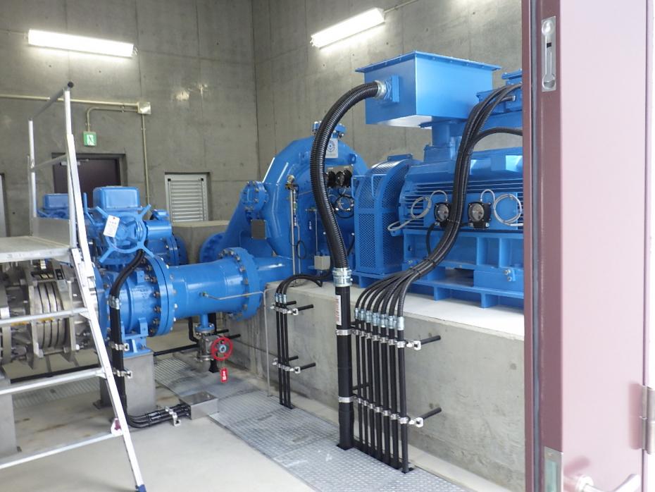 水源である神谷ダムから船津浄水場への導水(約100mの落差)を利用して水車を回し、水車に連結した発電機の回転により発電を行う「小水力発電設備」を整備しました。