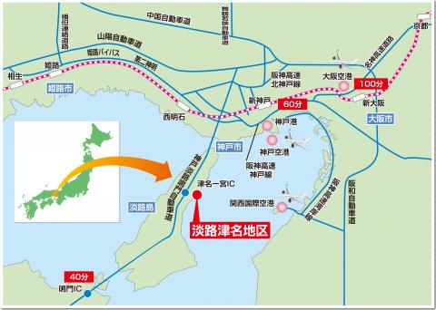 淡路津名地区は3つの特色ある地区から成り、志筑地区は淡路ワールドパークONOKOROや大型ショッピングセンター等が立地し、生穂地区は公共岸壁を備え、最大15.6haの区画を有し、佐野地区は県立淡路佐野運動公園が立地しています。