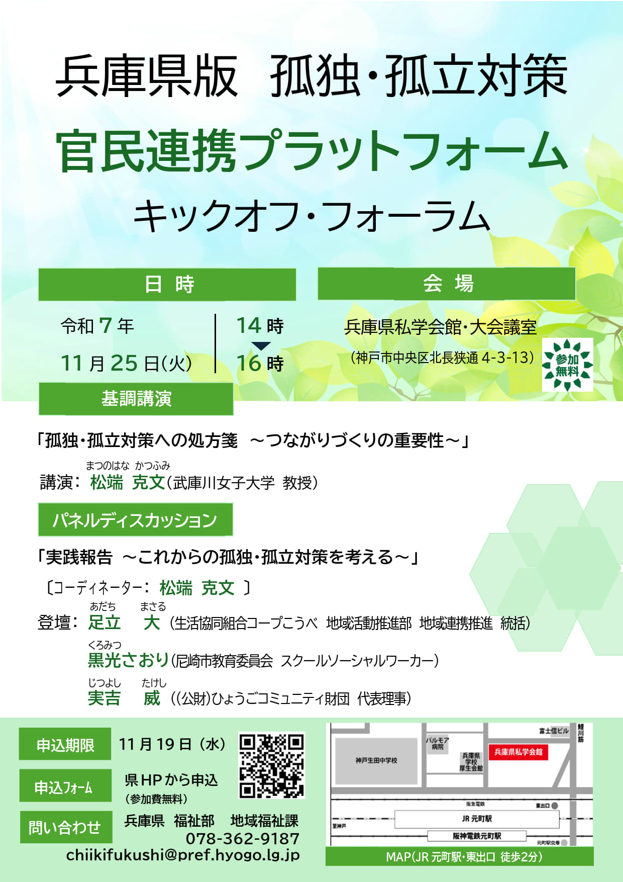 兵庫県では、孤独・孤立対策を進めるにあたり、社会福祉法人・NPO・協同組合・民間企業や地方公共団体等の支援機関の連携を促進するため、令和7年度に「兵庫県版孤独・孤立対策官民連携プラットフォーム」(以下「県PF」)を設置しました。
