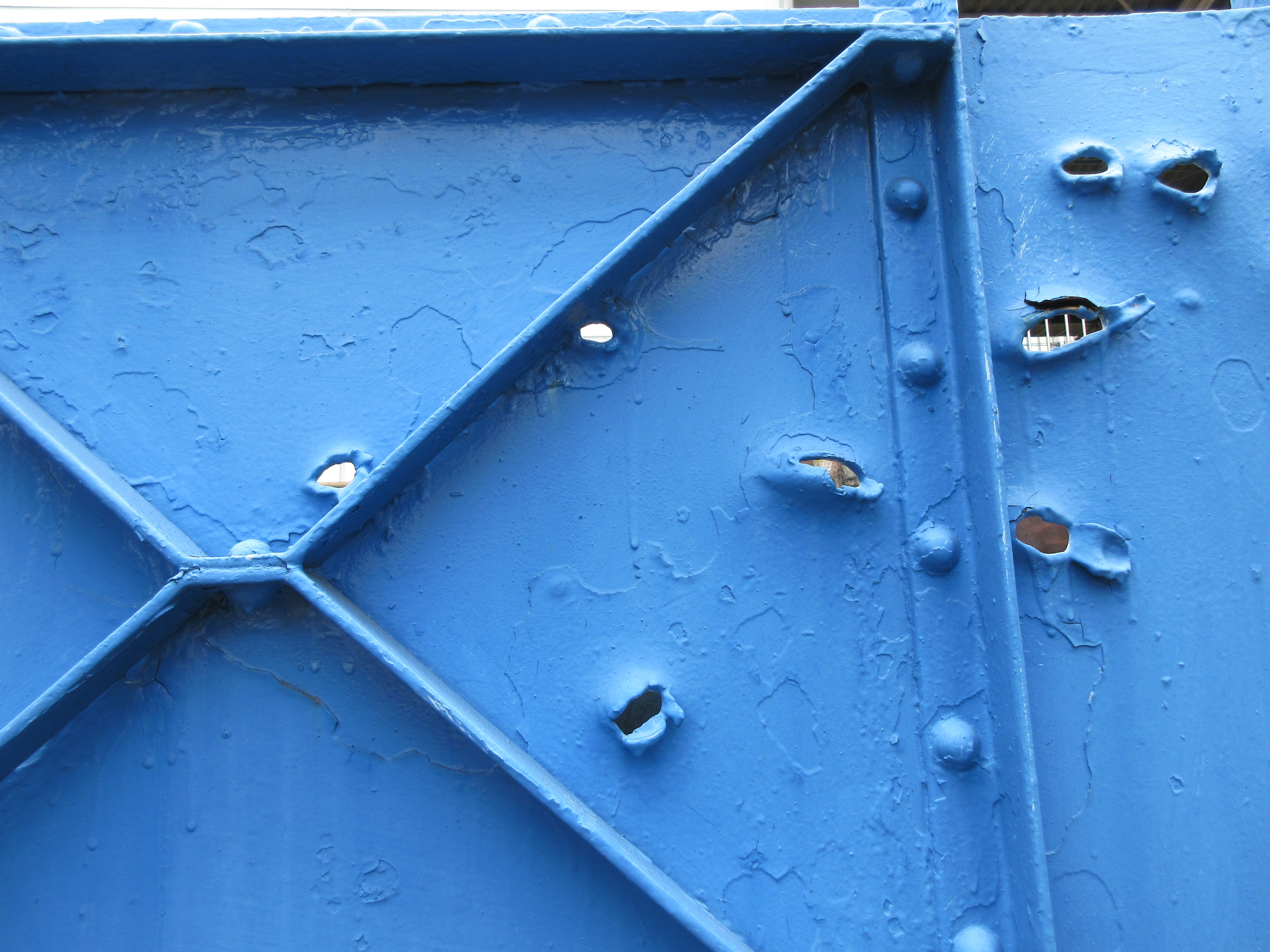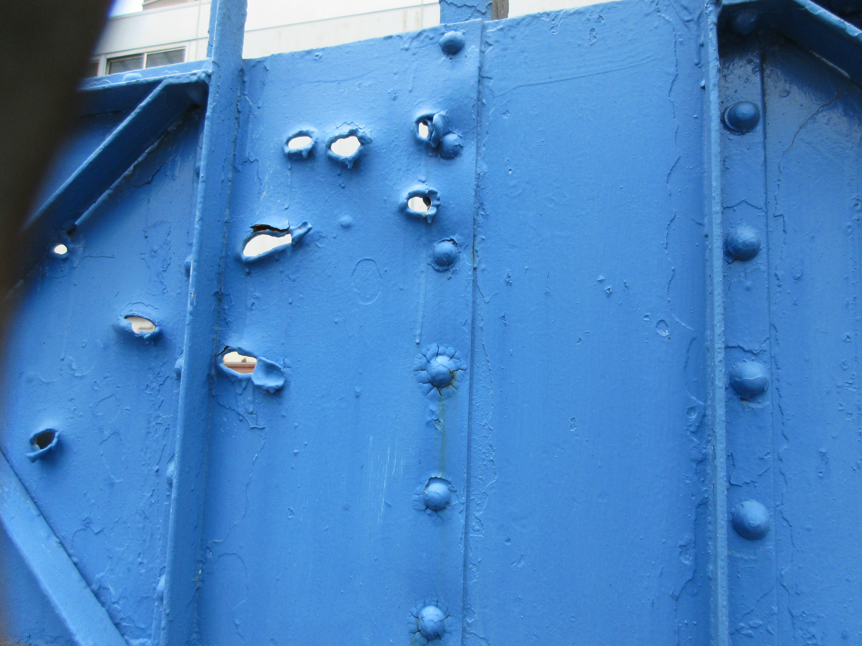 JR三ノ宮駅と阪急三宮駅を結ぶ連絡通路の横に見える橋梁をよく見ると、いくつもの穴が開いています。この穴はアメリカ軍戦闘機による機銃掃射痕と言われています。銃弾は鉄板を貫通し、めくりあげるほどの凄まじい威力であったことが見て取れます。