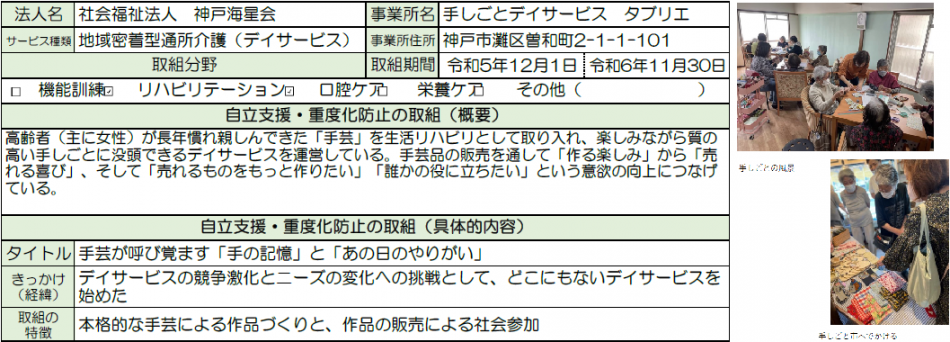 | 令和6年度 | 社会福祉法人神戸海星会 手しごとデイサービスタブリエ |