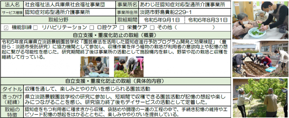| 令和6年度 | 社会福祉法人兵庫県社会福祉事業団 あわじ荘認知症対応型通所介護事業所 |