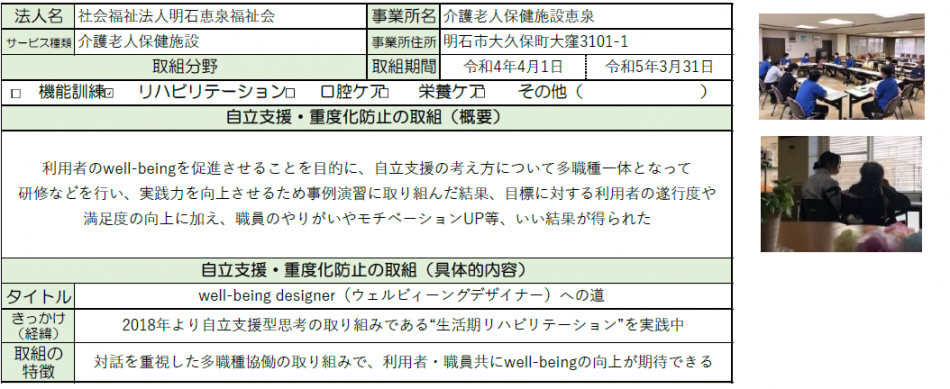 下記に、応募いただいた介護施設、事業所の先進的・好事例の取組を掲載しておりますので、介護施設、事業所の関係者及び利用者・ご家族等の皆様におかれましては、自立支援・重度化防止の普及推進にぜひお役立てください。