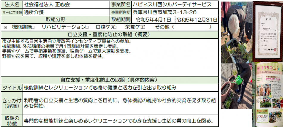 川西市の「日常生活自立度改善インセンティブ事業(令和5年度一般型部門(食事、介護の提供等))」に参加し、機能訓練や手芸、手指運動等のレクリエーション、園芸活動により、市内で最高改善率を達成。