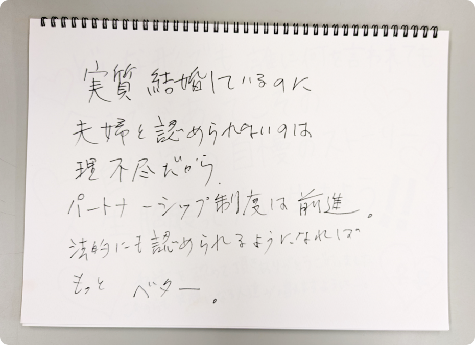 実質結婚しているのに夫婦を認められないのは理不尽だからパートナーシップ制度は前進。法的にも認められるようになればもっとベター。 |