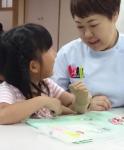 作業療法士さんにブレスレットの長さやビーズの色の組み合わせを相談しながら作っていきます。左手で糸を持ち、右手でビーズを通していきます。40分くらいで歩叶(ほのか)ちゃんにぴったりなブレスレットができあがりました。完成後はブレスレット作りに使った道具のお片付けもしっかりします。