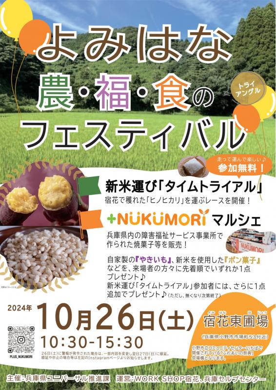 当日は、県内で農福に取り組んでいる事業所によるマルシェの開催や地域の子供たちに楽しんでいただける新米運びタイムトライアル、ポン菓子・焼きいもの提供等を実施しました。