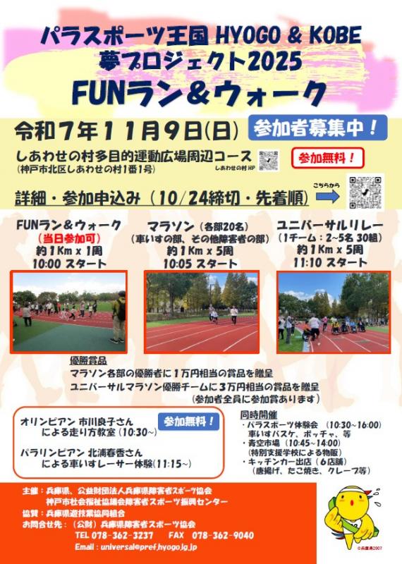 障害のある人ない人がスポーツを通じて相互理解の促進を図るとともに、神戸2024神戸世界パラ陸上のレガシー等を継承するため、神戸市と共同でパラスポーツ体験会やパラアスリートとの交流、特別支援学校による商品販売のほか障害の有無に関係なく参加できるFUNラン&ウォークイベント等を開催します。