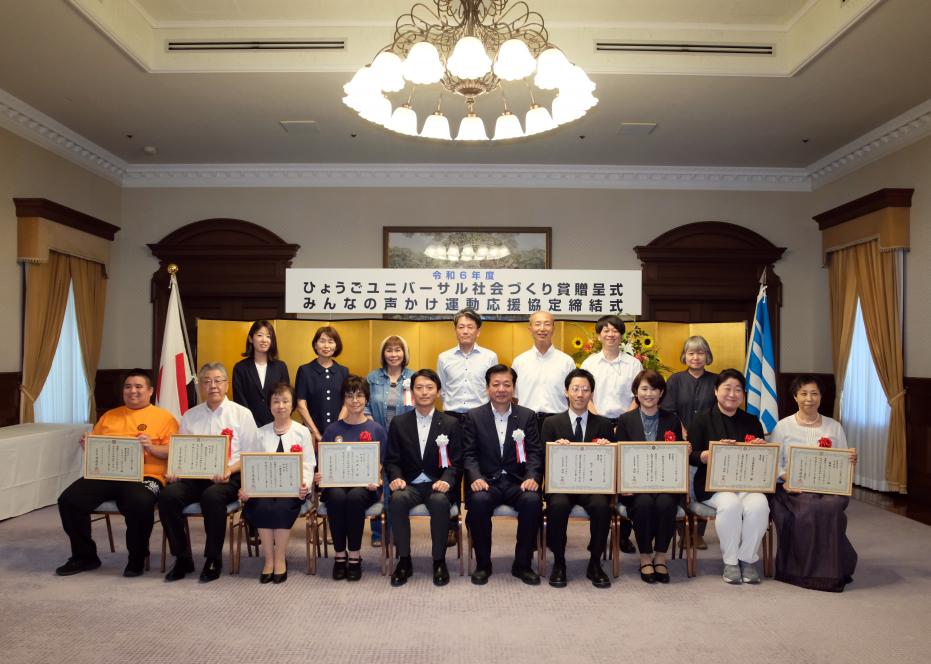 令和6年7月24日(水曜日)に、兵庫県公館にて「令和6年度ひょうごユニバーサル社会づくり賞贈呈式」を開催し、八尾敬子さん(宝塚市)、人権書道きらきら(三木市)、株式会社デンソーテン(神戸市)の皆さんが「知事賞」に輝きました。