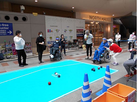車いすで行う卓球。ルールは一般の卓球とほとんど同じ。卓球台は車いすが卓球台脚部に当たらないように設計されている。