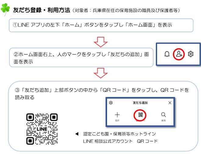 保育士等の資格を有する保育相談専門コーディネーターがチャットで対応します。LINEアカウント「認定こども園・保育所等ホットライン」を友だち追加してご相談ください。